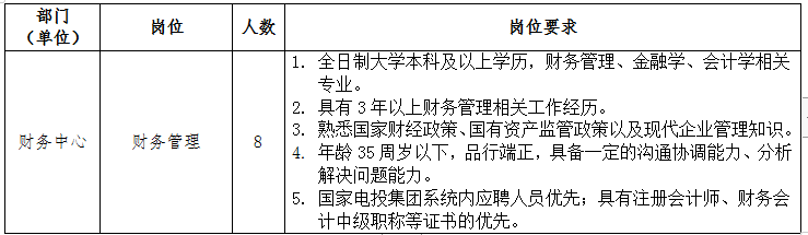 面向國家電投集團系統(tǒng)內(nèi)、外招聘財務(wù)管理崗位人員8人。
